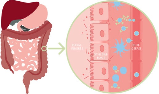 Bei Patient:innen mit Colitis ulcerosa ist diese Barriere geschwächt, da die Schleimhautzellen des Dickdarms durchlässiger sind als bei gesunden Menschen. Dadurch können Krankheitskeime wie Bakterien und schädliche Stoffe in die Schleimhaut eindringen. Das Immunsystem reagiert darauf mit Entzündungen, die teilweise chronisch verlaufen können und die Darmschleimhaut zunehmend schädigen. Bei Colitis ulcerosa ist hiervon in der Regel nur der Dickdarm betroffen.